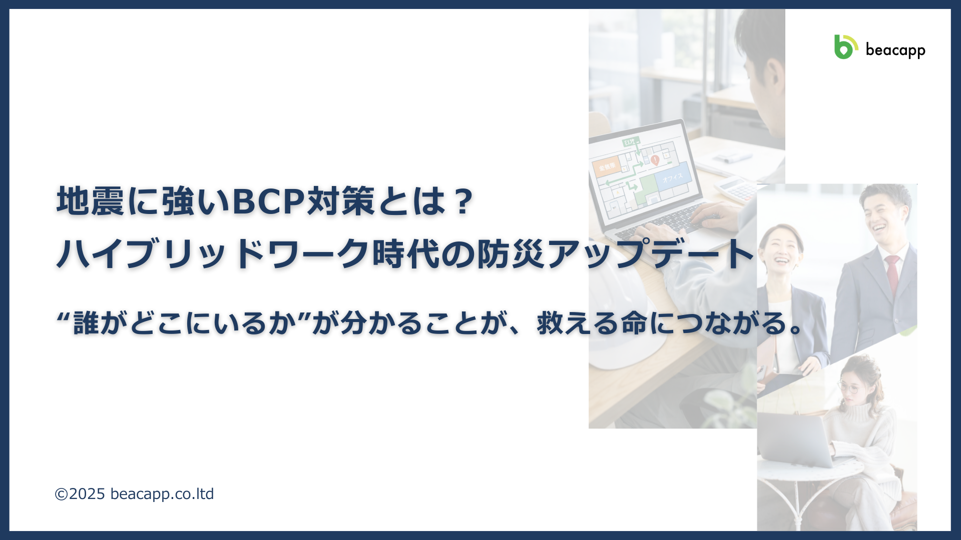 地震発生の際、“誰が出社しているか”を即時に把握できる新機能「地震速報連携機能」の実証レポート付き◯ Beacapp Hereがご支援する日常も、有事も、社員が安心・安全に働ける体制作りについて解説します。